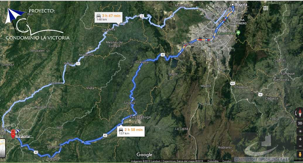 Localización estratégica. El Condominio Campestre La Victoria, localizado en el casco Rural del Municipio de Ricaurte – Cundinamarca, ubicado en el Km. 9.6 Vía Girardot – Bogotá, a dos minutos desde el punto de la Variante al Espinal vía Girardot, (a 1 hora ó 99 Kilómetros) de la Capital de la República por la doble calzada.